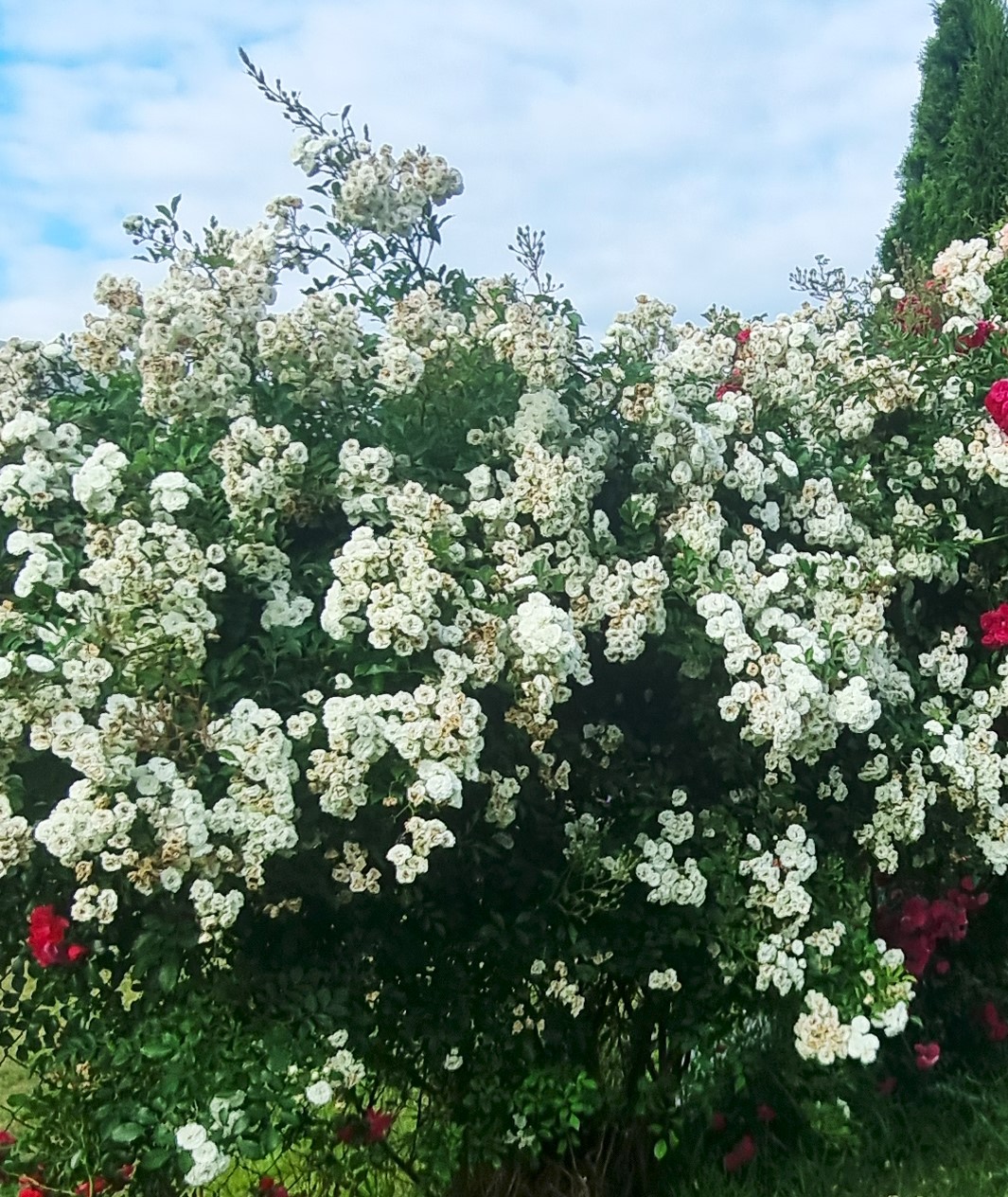 Zastosowanie: idealnie sprawdzi się jako roślina rabatowa w grupowych nasadzeniach, gdzie kilka egzemplarzy tworzy szeroką, białą masę kwiatową, która rozświetla ogród i stanowi wyrazisty, a jednocześnie delikatny akcent kolorystyczny. Posadzona jako soliter na tle trawnika lub ciemniejszej zieleni będzie eleganckim punktem ogrodu, wyróżniającym się czystością barwy i formą. W nasadzeniach mieszanych z bylinami i trawami ozdobnymi komponuje się znakomicie. Biel kwiatów tworzy kontrast z kolorami i teksturami sąsiednich roślin, a rozłożysty pokrój pozwala wypełnić przestrzeń bez konieczności intensywnej pielęgnacji. Idealnie nadaje się równie do prowadzenia na pergole oraz ogrodzenia tworząc kwitnący całe lato aż do jesieni parawan.
