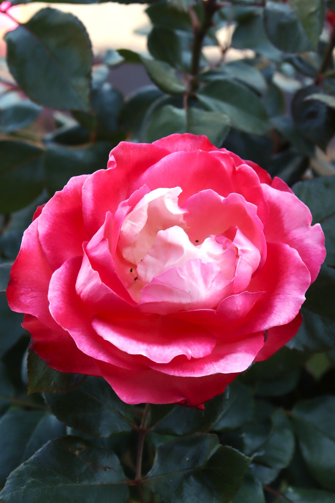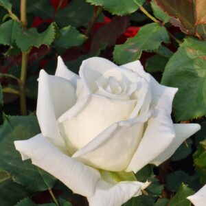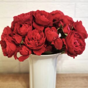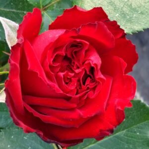 Nostalgie® to róża, która łączy klasyczny urok z wyrazistym kontrastem barw — kremowy środek płatków harmonizuje z ostrymi, wiśniowymi brzegami, które w miarę rozkwitu mogą delikatnie przechodzić w jasne kremowo-różowe tony.