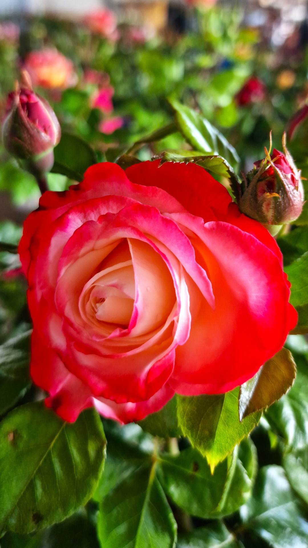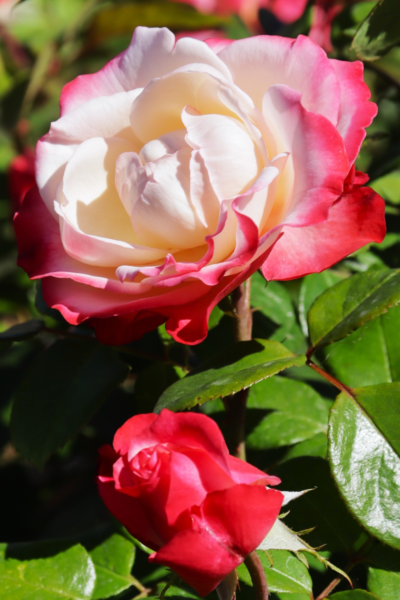 | Kolor kwiatów | dwukolorowa: kremowo-biały środek i brzegi płatków w odcieniu głębokiej czerwieni |